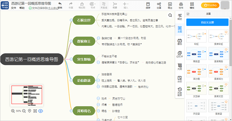 ??例如本文以“西游记第一回概括”为思维导图中心词进行扩展,那么我们可以根据这个中心内容延伸并拓展出许多与之相关的内容,而这些分支内容可以理解为对中心词的归纳。
