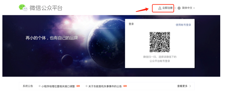 1、在网页上搜索并登录微信公众号平台,在页面的右上方点击“立即注册”。