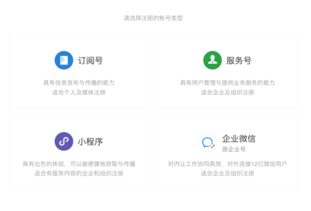 2、根据自身的需求选择选择注册帐号类型,共有四种,分别是微信订阅号、微信服务号、微信小程序、微信企业版。