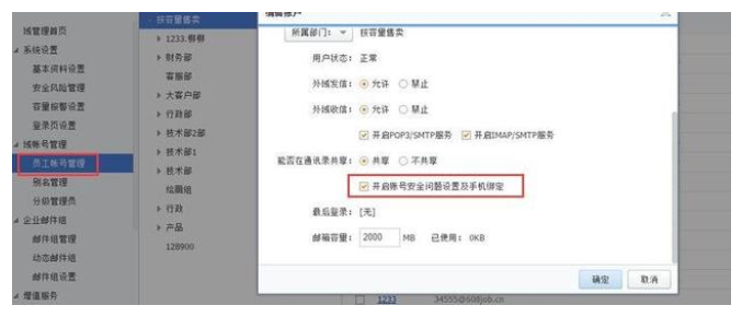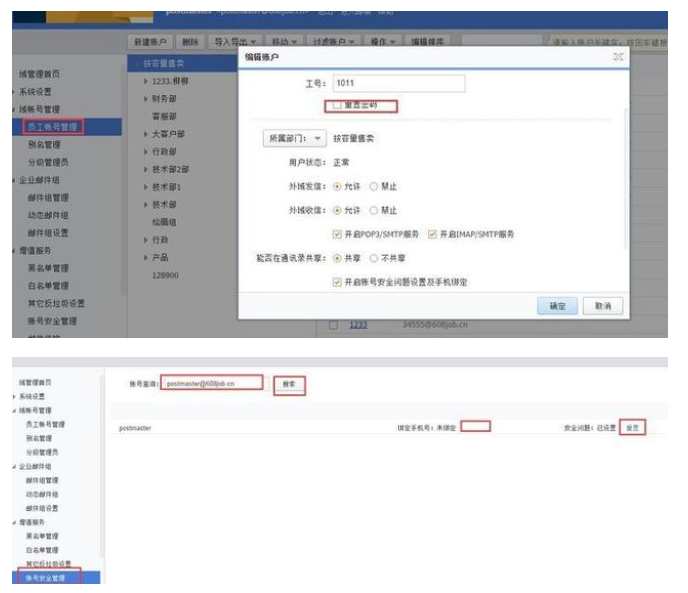 2、如果不记得安全问题的答案 ,手机号码也不能使用了,就需要公司的邮箱管理员登录postmaster到帐号管理,找到此帐号编辑里面重置帐号密码,并提醒管理员可以到帐号安全里面把安全问题与手机号码解绑,最后重新登录并重新绑定即可。