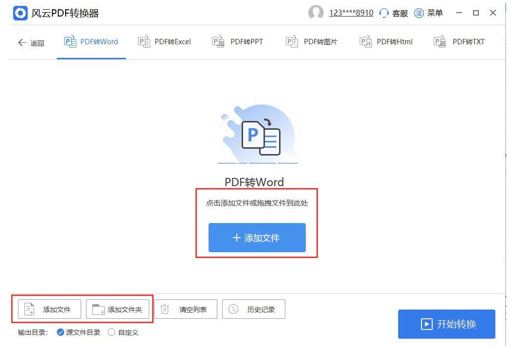 3、点击“+添加文件”上传pdf。如果需要转换大量文件,也可以通过下方添加文件或文件夹批量导入。