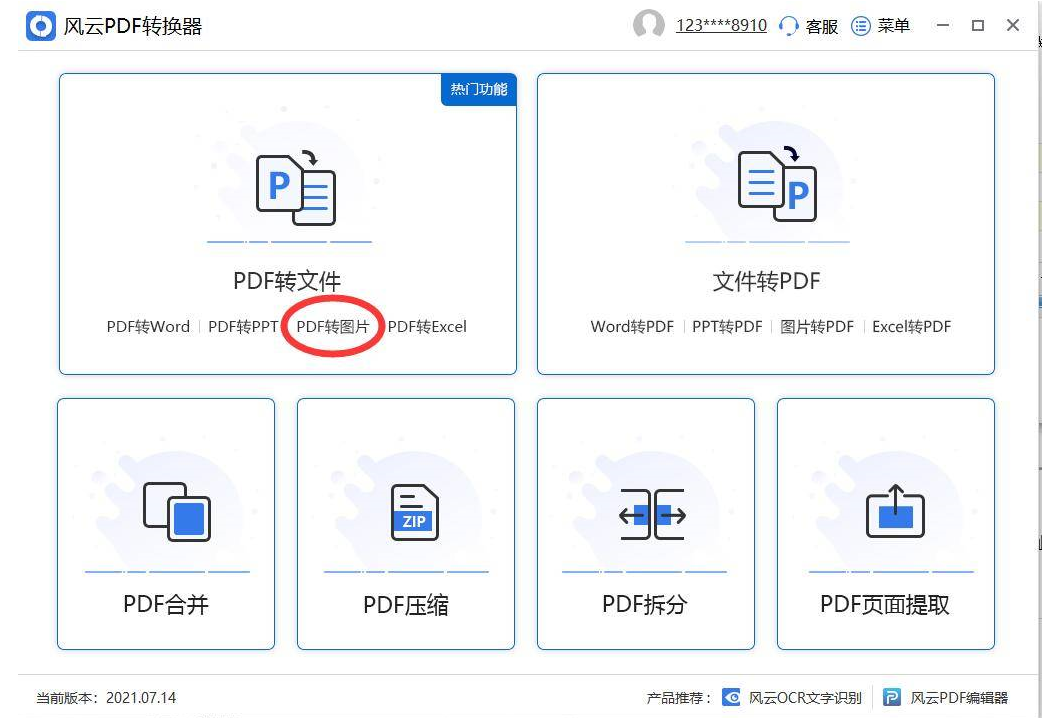2、在PDF转文件的版面中,点击下方的PDF转图片。