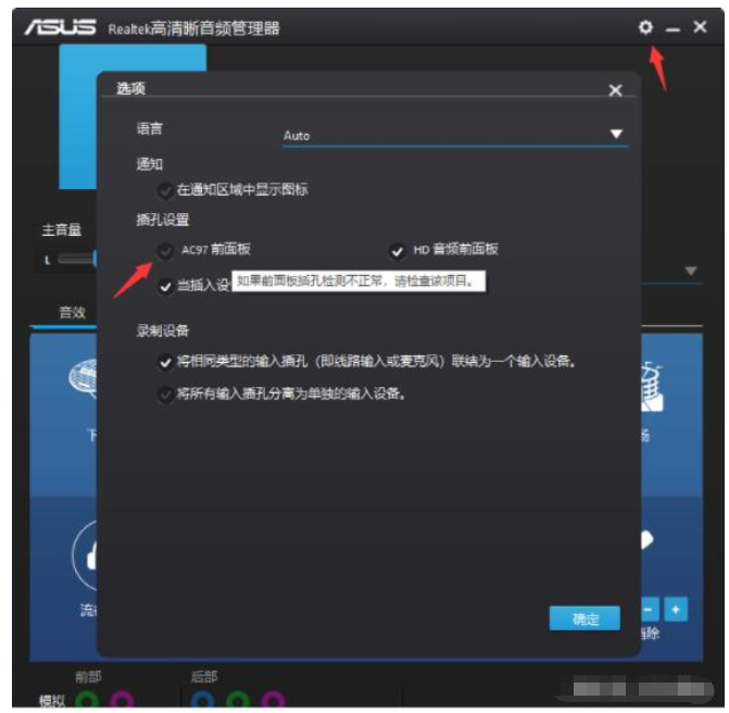 3、点击设置,取消勾选禁用前面板插孔检测即可。(不同的电脑品牌音频管理器会有差异,下面小编分享了两种品牌的操作,大家以自己电脑品牌的操作为主)
