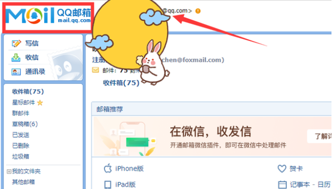 2、在qq邮箱主界面中,会看到左上方就是qq邮箱的地址:mail.qq.com,右侧会显示有自己的qq邮箱地址,是自己的qq号后面加上@qq.com。
