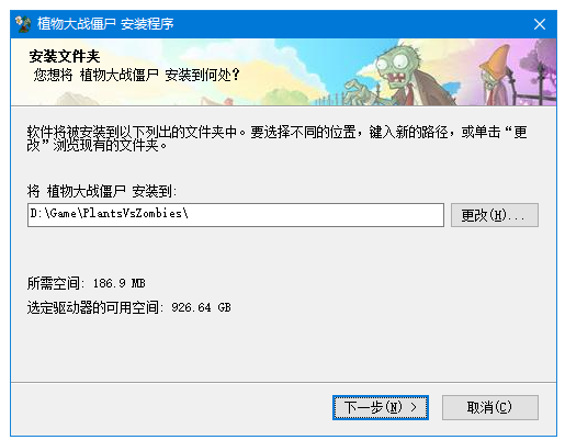 1、首先官网上下载植物大战僵尸压缩包,使用360解压软件解压后,双击.exe文件进入植物大战僵尸简体中文版安装导向,更改程序的安装路径,然后点击【下一步】进行安装。