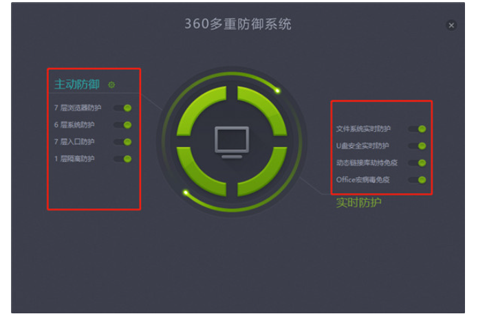 2、点击每一个选中的绿色按钮,多重防护全部开启。点击右上角的取消我们返回主界面;