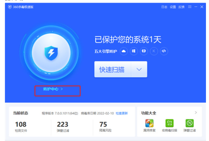1、打开360杀毒极速版软件,点击防护中心进入新的界面。