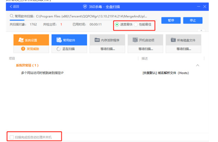 5、注意左下角的“扫描完成后自动处理并关机”和右上角的“速度最快””性能最佳“本人建议选择性能最佳;