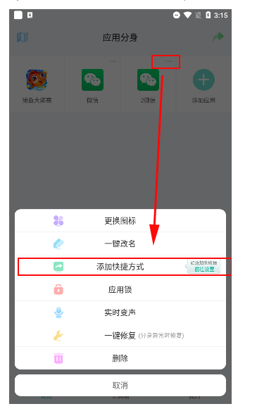 4、点击分身的右上角三个点位置,进行添加快捷方式。