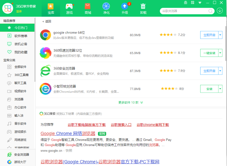 4、如果电脑上有安装360软件管家或者类似软件的话,也可以直接在上面搜索谷歌浏览器即可一键下载安装了。(小编是已经安装好的,所以显示的是立即开启)