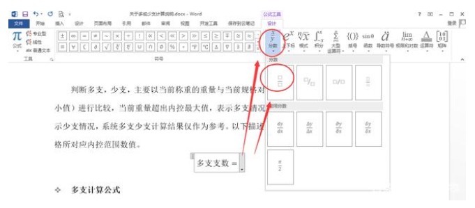 4. 在公式编辑区域输入等号及左侧的内容,在输入右边内容时,在公式工具中【分数】选择一个分数样式,如第一个。