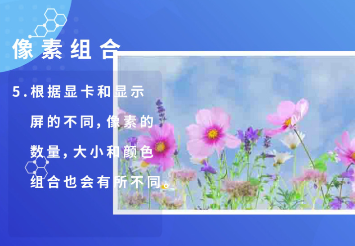 3、根据显卡和显示屏的不同,像素的数量,大小和颜色组合也会有所不同。px(像素)的尺寸和屏幕的分辨率有关,分辨率比较高的像素,色板也就越丰富,越能表现颜色的真实感。