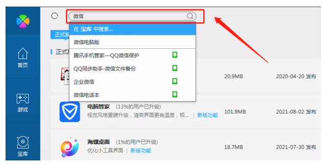 1、在电脑桌面打开软件管家,在上方的搜索栏输入“微信”。