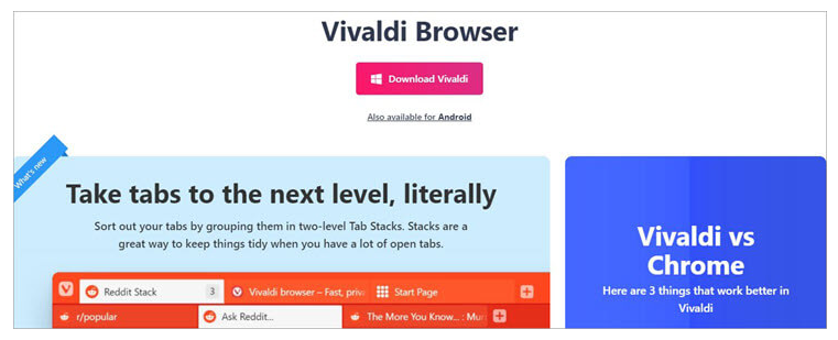 基本介绍:Vivaldi 是一款具有一些独特功能的 PC 浏览器,通过阻止广告和跟踪器为用户提供快速安全的浏览体验。该浏览器适用于 Android、Mac、Linux 和 Windows。它支持 53 种语言。