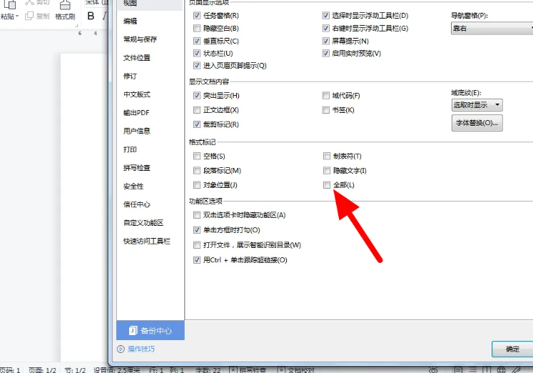 1、首先打开文档选项,勾选格式标记下的全部;