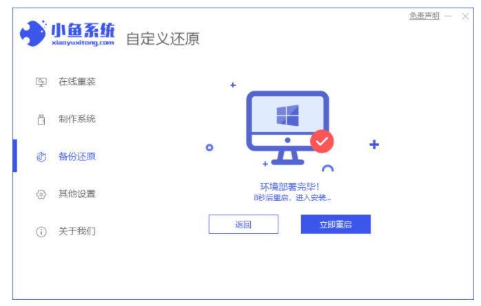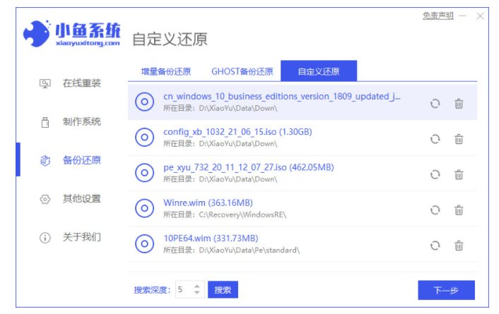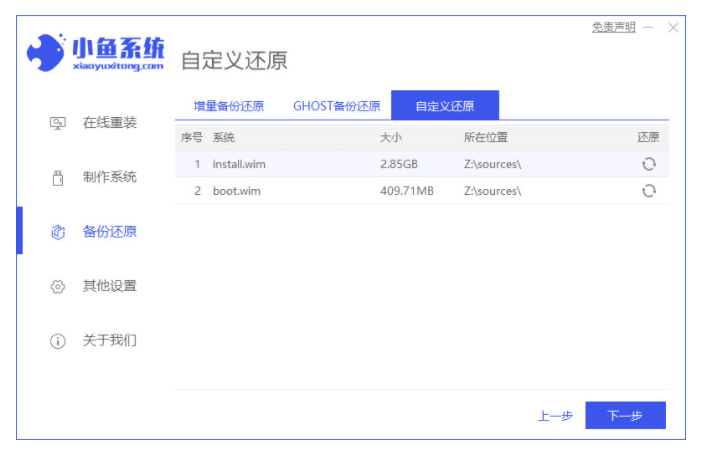 2、打开小鱼一键重装系统工具,点击备份还原,找到已下载的win10镜像。