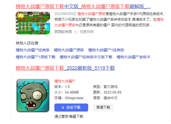 1、浏览器中搜索植物大战僵尸电脑原版下载。