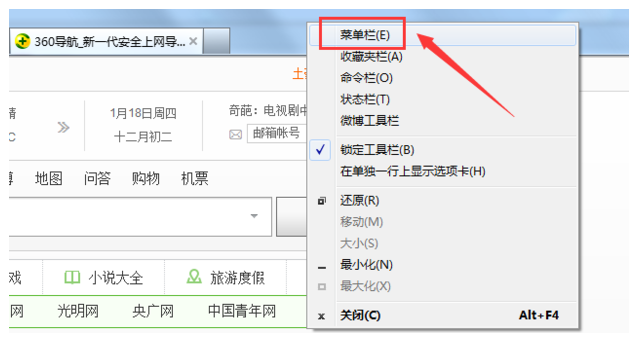 2、鼠标右击浏览器上方任意空白处,随后出现下拉列表,点击“菜单栏”。