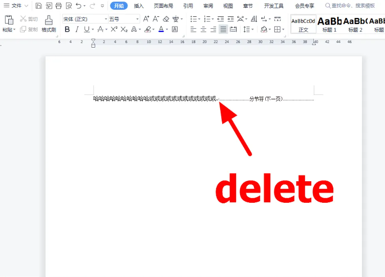 4、将光标定位到分隔符位置,按下delete键,即可删除空白页。