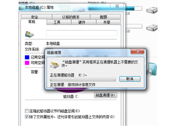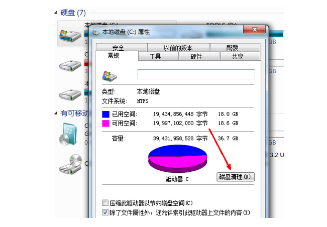 6、如果电脑的磁盘空间太小,还可以在属性页中选中压缩驱动器来节约磁盘空间,通过这种途径可以一定程度上节约空间。