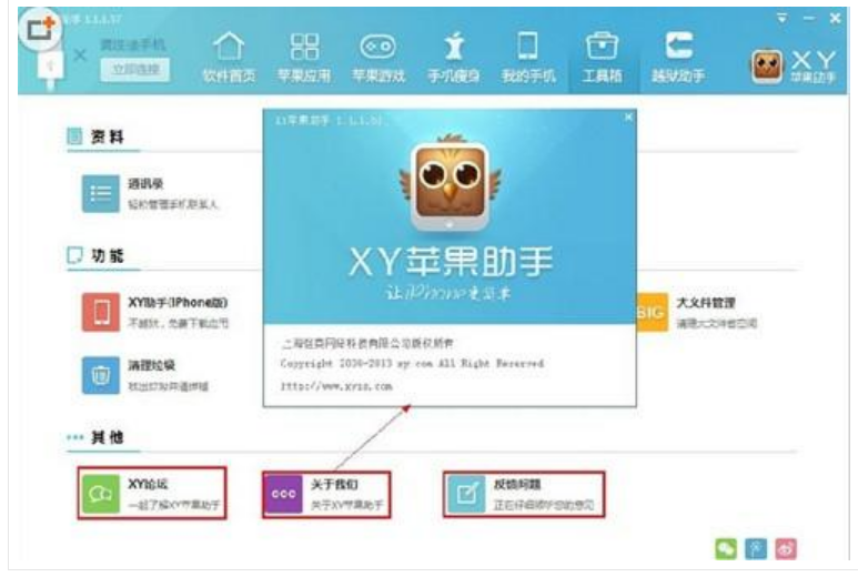 3、点击“XY苹果助手论坛”按钮,会跳转到XY苹果助手论坛,点击“关于我们”按钮,会弹出XY苹果助手的详细信息对话框。