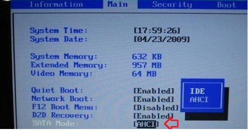 2、进入BIOS设置后,【Main】选项下,选择【SATA Mode】按回车,弹出2个选项【IDE】和【ACHI】,选择【IDE】,再按【回车】确认就可以了