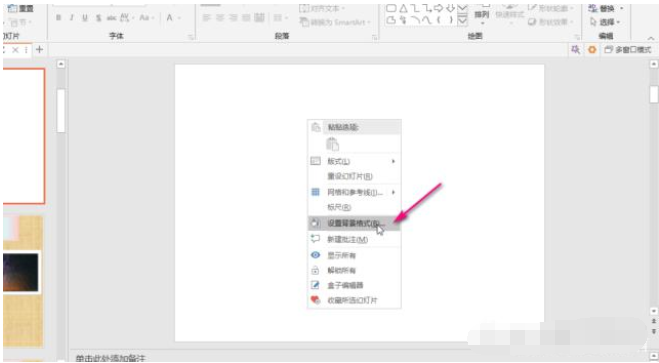 2、在空白幻灯片中,鼠标右键单击,选择“设置背景格式”。