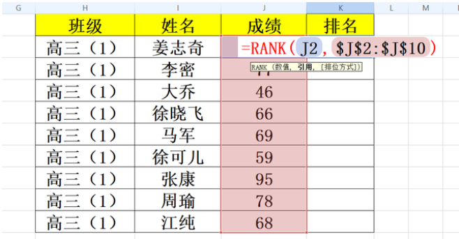 根据对应参数,我们选中J2单元格,输入一个逗号,然后接着引用整个数据区域,即J2:J10区域(并加上绝对引用),最后一个参数可以选择降序排名,所以就不填或者填0了。