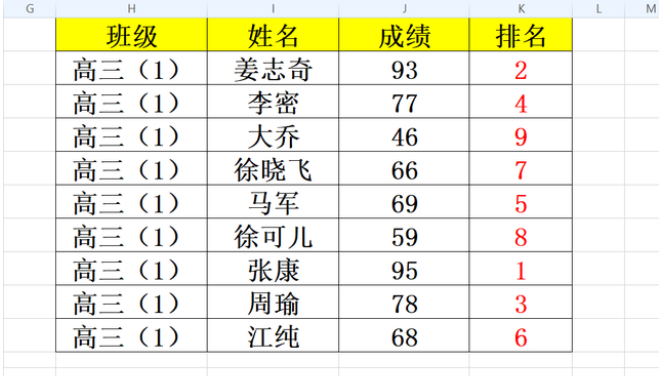 4、然后直接回车确定,就可以在表格的旁边显示出成绩排名。