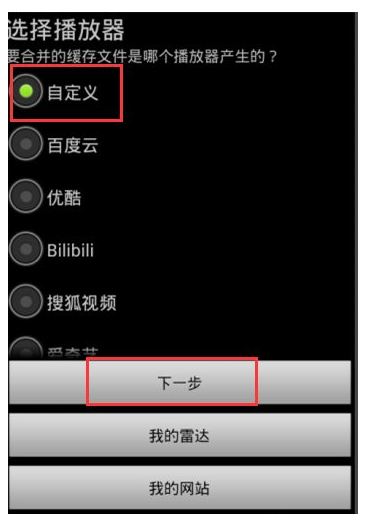 1、首先在UC浏览器的菜单里“我的视频→正在缓存”。随后打开“缓冲合并工具”,选择“自定义”,点击“下一步”。