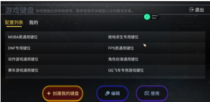 3、选择好之后就能使用虚拟按键完啦,但是通常预设的虚拟按键可能不适合每个人的操作习惯,这里我们可以进行创建自己的虚拟按键。这时点击【创建我的键盘】就可以开始进行这设置了。