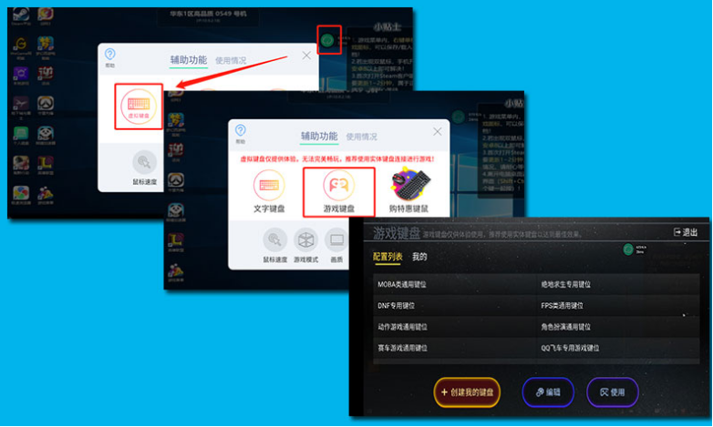 2、选择好之后就能使用虚拟按键完啦,不过通常预设的虚拟按键可能不适合每个人的操作习惯,这里我们可以进行创建自己的虚拟按键。单击【创建我的键盘】就可以开始进行这设置了。