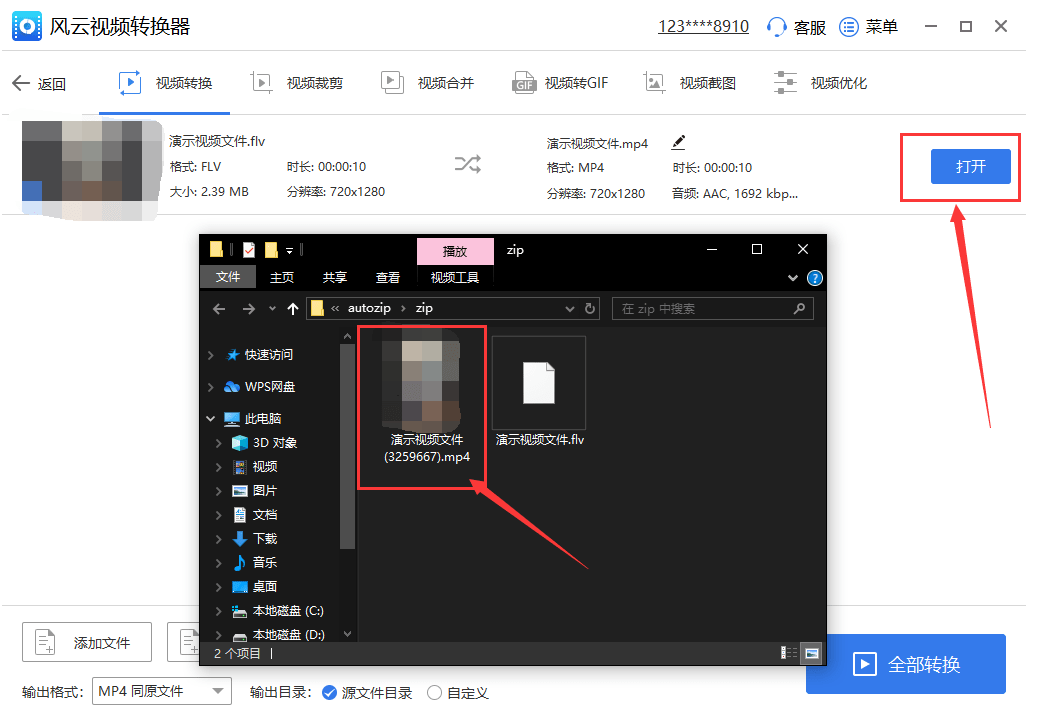 8、视频转换完成之后,就会跳出“打开”按钮,也意味着视频转换成功。有需要的话可以点击“打开”,在跳转的弹窗文件夹中就能查看到最终MP4格式的视频了。