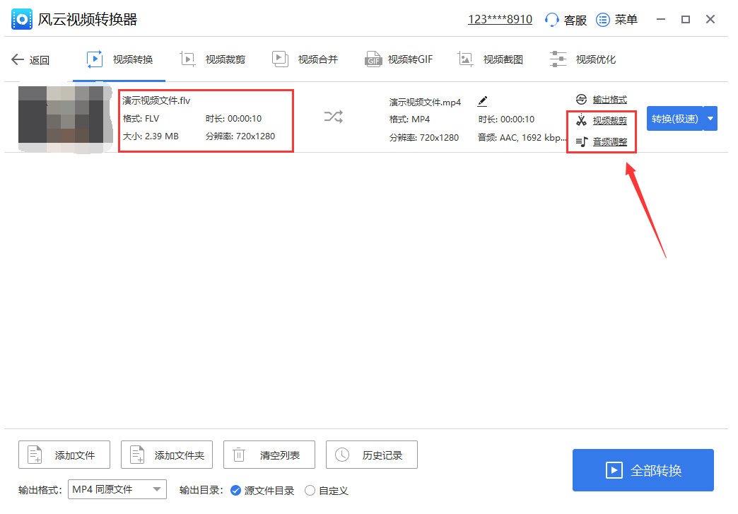 3、随后将需要转成mp4的视频文件添加到列表之后,即可看到视频文件的格式、大小、分辨率、时长等视频详细的信息,若您有需要可以点击“视频裁剪”或“音频调整”进行适当调整。