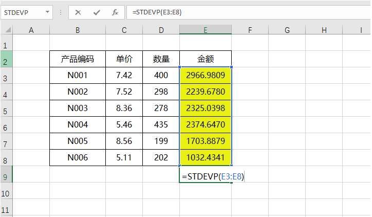 2、然后在单元格中输入“=STDEVP(E3:E8)”,按下回车键,标准差就计算出来了。