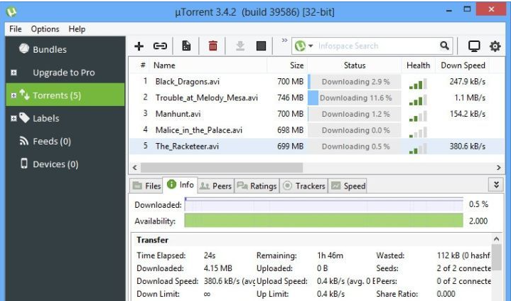 uTorrent是一款内存消耗极少的超小型迷你BT客户端。内网下载方面也有不错的表现,外网就更不用提了。支持多任务同时下载,支持设置文件下载优先级,可以根据计划任务调整占用的带宽,全局/单个任务的速度限制,快速断点续传机制,支持UPnP,支持流行的BT扩展协议,最小内存占用仅6MB。