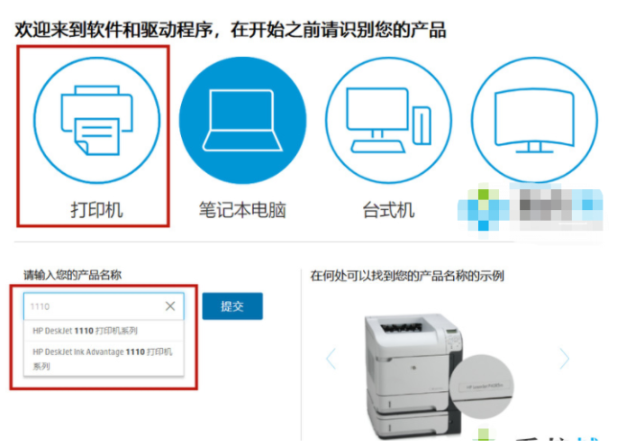 2.此时选择“打印机”,跳转进入新的界面。然后查看自己的打印机型号,通常打印机上面有显示。请输入你自己的打印机编号,如1110,在“产品名”中输入你的打印机。然后我们根据下拉选择具体的型号,单击“提交”。