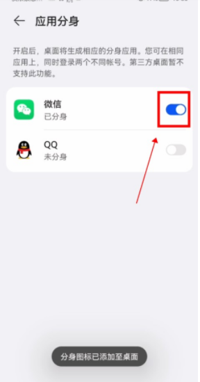 4、在应用分身页面中,开启“微信”分身按钮即可。