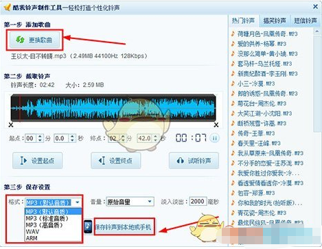 6、我们根据下图所示进行操作:选中想要进行转换的歌曲,截取想要的长度,选择歌曲格式【MP3】,点击【保存到本地】就完成啦。