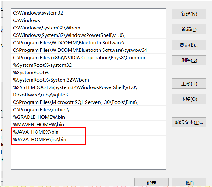 4、此时设置Path环境变量,该变量已经存在,所以在列表中选择Path,点击下面的“编辑”按钮,在弹出的窗口中添加如下信息:%JAVA_HOME%\bin;%JAVA_HOME%\jre\bin,鼠标点击“确认”即可。