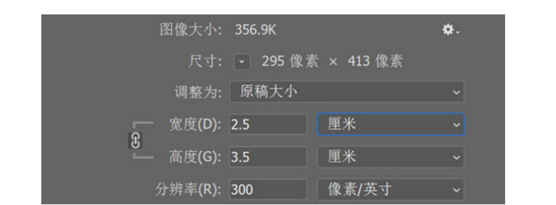 2、1寸照片,尺寸大小是:2.5厘米×3.5厘米,分辨率设成300像素/英寸,这样最终得到的像素是:295×413。