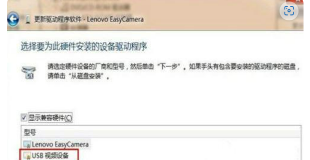 3、弹出挑选为此硬件装置的设备驱动程序中,型号处挑选“usb视频设备”驱动更新。