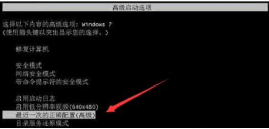 2.在进入高级引导选项之后,从高级引导选项中,选择最后一次正确配置。之后返回,执行完毕后的所有操作均可进入系统。