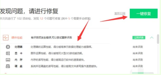 3、 耐心等待软件扫描分析硬件完成之后,我们就可以看到电脑的故障问题,点击一键修复。