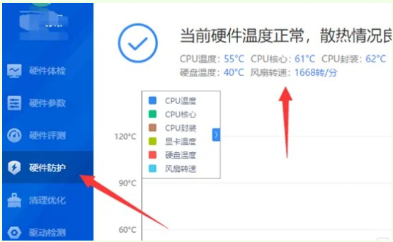 4、 点击硬件防护,监控硬件温度,以免高温导致电脑死机,建议同时加强物理降温。
