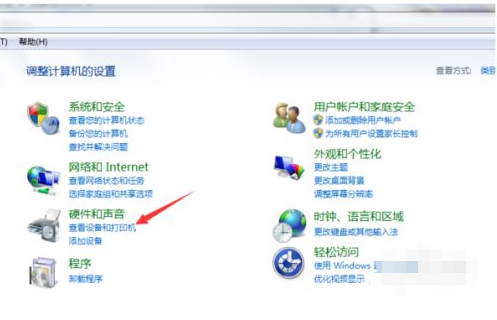 1.首先把打印机的线与电脑的线连好,点击打开win7系统的控制面板,点击“硬件和声音”下面的“查看设备和打印机”;