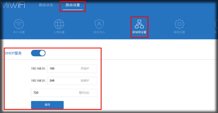在路由器的管理界面,点击【路由设置】——【局域网设置】,填写后点击保存即可。
