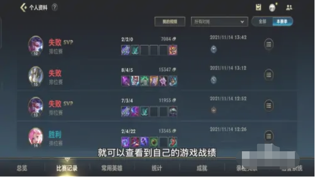 2、然后点击下方的比赛记录选项,就可以查看到自己的游戏战绩。