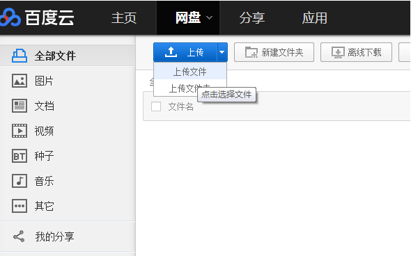 4、可以看到,百度云盘可以上传图片、文档、视频、种子等等,也可以上传文件夹。