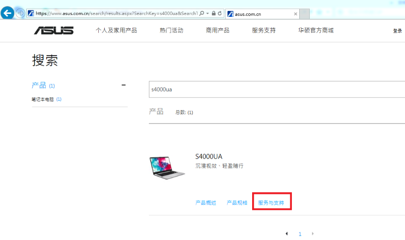 3、或者在输入产品型号以后,点击搜索框右侧搜索,在搜寻结果列表中找到产品型号,点击下方的“服务与支持”进入驱动下载页面。
